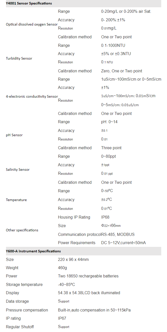Y4001 sensor and Y600-A instrument for the measurement of pH, ORP, optical dissolved oxygen, conductivity, turbidity, temperature, salinity and more. Y4001 sensor allows for measurement of up to 5 parameters. They are automatically recognized by Y600-A instrument when connected. A backlit display, brief interfaces, simple operation keyboard, convenient calibration procedures, rechargeable battery, large log memory and powerful PC data program (Meter Read) make the instrument user friendly.