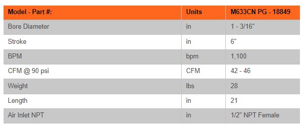 The APT Model M633CN PG Handle Airgo-Line® Rivet Buster measures only 20 - 5/8" in length, delivering more power to those tight spaces. Weighing just 28 lbs, it`s perfect for limited access work or whenever a compact, lightweight, and powerful tool fits the bill. The tool features an innovative cylinder design that reduces overall weight without compromising tool`s strength or hitting force.
