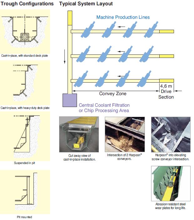 In-Floor Conveyor efficiently collects high volumes of wet or dry metal chips. This workhorse transfers all types of metal chips, fines and turnings, wet or dry bushy wads and tramp metal solids with time and energy saving efficiency. Its liquid-tight trough construction is ideal for high-volume coolant flow applications.