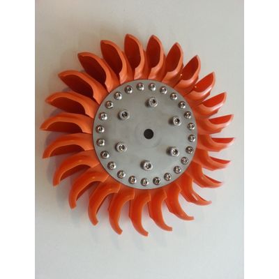 Custom Orangespoon runners for use with nozzles up to 1 1/8″ (28mm) diameter.  Assembled runner includes; Custom or basic arbor Stainless hub, 16 to 24 orange spoons (5.9-7.8″ or 149 – 198mm pitch diameter)