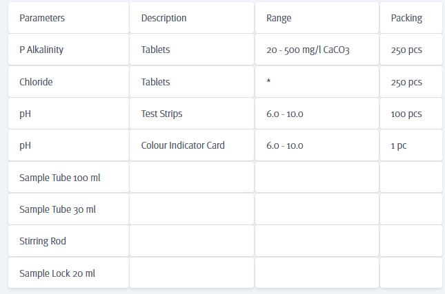 The boiler water test kit contains all equipment and test reagents for everyday testing, optimising treatments and monitoring critical control parameters. The boiler test kit is based on a tablet count method and colour comparator chemistry. Testing instructions are included within the robust casing of the central boiler water test kit.