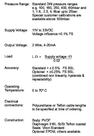 The HPTX23 Series is the latest generation of fully submersible 2 wire 4-20mA current output transmitters made of P.V.D.F. Having excellent chemical resistance the transmitter can be used on a wide range of aggressive liquids. The pressure sensing element consists of a robust, high accuracy, piezoresistive silicon sensor mounted in a stainless steel housing which is fully isolated from the media by a P.T.F.E. coated stainless steel diaphragm and filled with oil. The hydrostatic pressure acts on the diaphragm and is transferred through the oil onto the sensor. The sensor assembly and transmitter electronics are sealed in a P.V.D.F. housing. Electrical connection to the transmitter is via a sealed in depth cable with integral vent tube, available in either polyurethane or P.T.F.E. construction. Pressure ranges are to DIN std e.g.100,160,250,400,600mbar and 1, 1.6,2.5,4, 6, 10, 16, and 25 bar. Special customer calibrations are available abovelOOmbar.