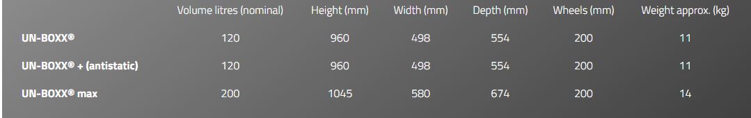 - The UN-BOXX® is easy and safe to handle and transport in an upright, healthy posture thanks to its low weight and large wheels with solid rubber tyres.