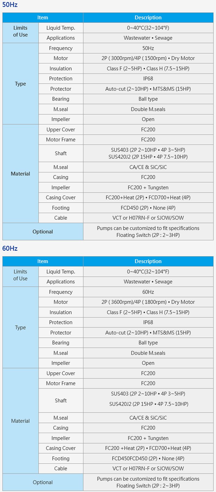 - Standard accessories include : cable with an epoxy resin sealed water-resistant cable base, Auto-cut motor protector, double mechanical seals and oil seal design.