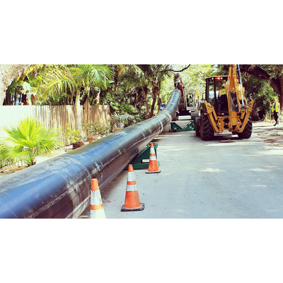 While the towing load keeps the HDPE under tension during the pull, the pipe remains in its reduced size. The HDPE remains fully elastic throughout the reduction and installation process. After installation, the pulling load is removed. The HDPE pipe expands until it is halted by the inside diameter of the host pipe. The effectively natural ‘tight’ or ‘compression fit’ is accepted as exchanging an existing failing pipeline with a composite pipe in its place.