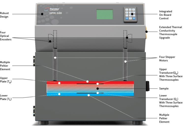 Stepper motors are controlled by individual optical encoders for the measurement of sample thickness (L), to the nearest 0.05 mm (0.0019 in). Integrated logic between stepper motors allows the upper plate to sense and adjust for specimens with surface variations, optimizing plate – specimen contact for measurements. One heat flux sensor is integrated into each plate, and is used to monitor heat flux (Q/A), generated due to the difference in temperature (ΔT) between the top and bottom plate at regular intervals, until steady-state heat flux is observed. The composite heat flux is then used to measure thermal resistance (R) and calculate thermal conductivity (λ) according to Fourier’s Law.