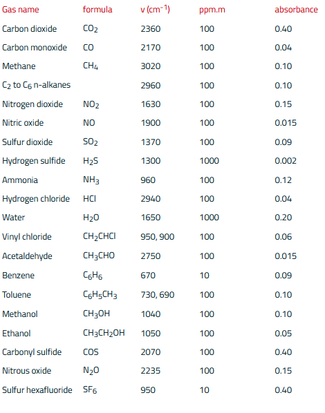 Which pathlength should I choose? The absorbance of a gas depends on the distance travelled by the IR light beam through the gas sample. The relationship between absorbance, A, concentration, C, and pathlength, L, is given by Beer’s Law: A = -log10 (I/I0) = a.C.L Atmospheric concentrations of gases are usually expressed in C.L units of ppm.m – the number of molecules that would be encountered by the infrared beam across a 1.0 m path. A gas at 0.1 ppm atmospheric concentration will absorb as much IR light over a pathlength of 100 m as would the same gas at 1 ppm over 10 meters or at 10 ppm over 1 meter. Accordingly, the pathlength of cell should be chosen to give absorbance values within the spectrometer’s linear range for a given concentration. The following table may be taken as a guide: