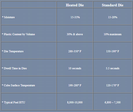 It’s great to have a good memory – unless you are trying to reshape the plastics in your waste stream into a densified form – CUBED ENERGY. Warren & Baerg has an answer for you – HEATED DIES. With our HEATED DIES you can have a higher overall moisture content in your infeed materials that can help. But what is really important is the amount of plastic – particularly film plastic – you can now process into CUBED ENERGY™. The heat sears the outside of the cubes, giving you a higher quality fuel that is easier to handle and transport. And of course, more plastic means a higher BTU value for fuel. Like our standard dies, the HEATED DIES can be changed and maintained easily and individually.