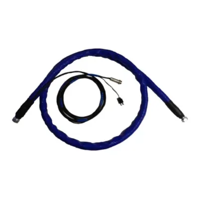 The Teflon lined hose has an outer stainless steel braid enclosed in protective sleeve. Leads from hose attached to power supply with separate power and thermocouple connections.