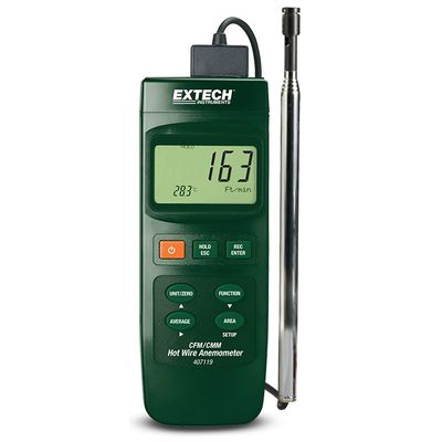 The 407119 Heavy Duty CFM Hot Wire Thermo--Anemometer uses a telescoping probe (extends up to 3 ft) which is ideal for use in ducts and ventilating systems. It can accurately measure Air Flow (CFM/CMM), Air Velocity and Temperature. Air Flow can be displayed as an instantaneous value or up to a 20 point average. Additional functions include Data Hold, Min/Max, and Auto power off. Comes complete with telescoping probe with 5.5ft cable, and 4 x AA batteries.