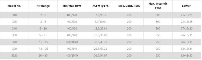 - Intake unloaders for loadless starting, increased energy savings and reduced motor wear.
