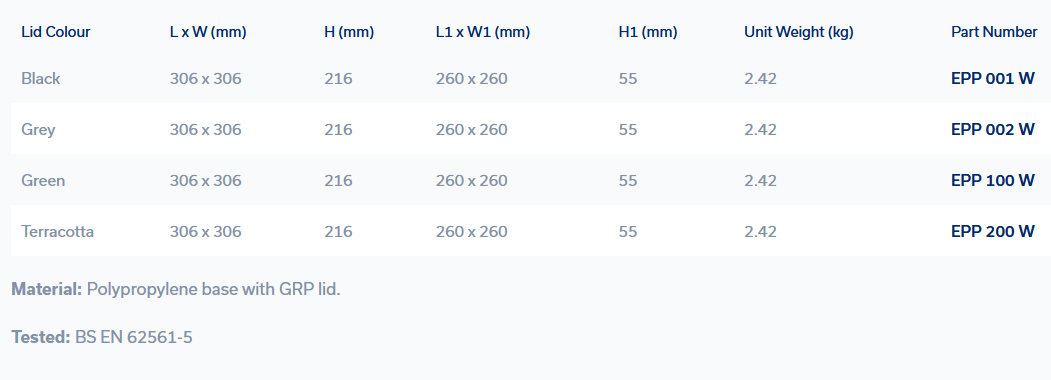 The housing will withstand loads of up to 6,000 kgs and is suitable for most commercial and industrial applications. The lid locks into the base and can be opened with a standard flat screwdriver. The base has three built-in slots for locating earth bars.