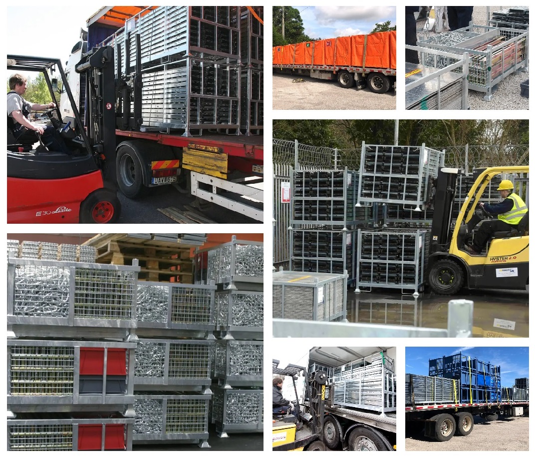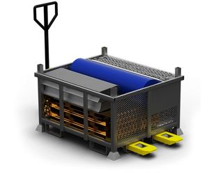 The support crate is designed to hold 33 supports, which are stacked in three rows of 11 supports each. The size of the crate vary depending on the specific model. Furthermore, these crates are stackable within the same model, providing an efficient use of storage space. The sides of the crate can be easily detached to facilitate loading and unloading.