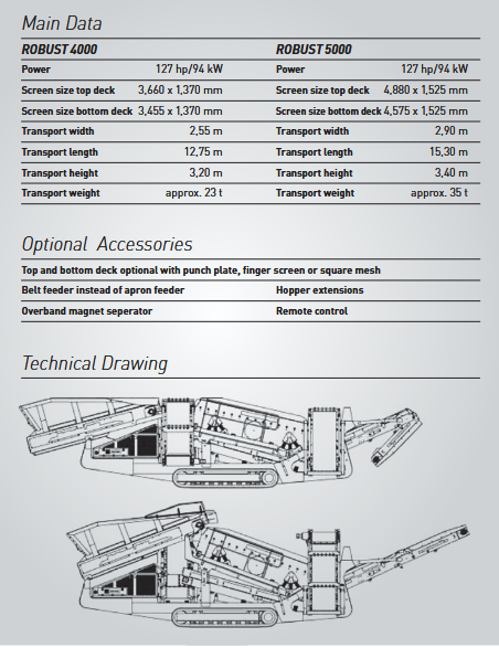 ENDERS ROBUST 4000/5000 robust heavy-duty screening machines for high outputs, for screening coarse and heavy material. The ENDERS ROBUST 4000 and ENDERS ROBUST 5000 machines are outstanding professional tools and are therefore ideal for screening/scalping in quarries and for demolition waste, heavy rock or for difficult-to-screen material.