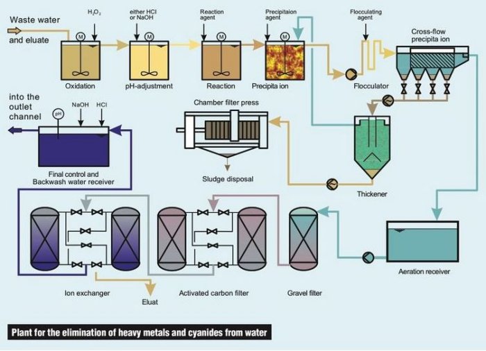 For the removal of heavy metals several treatment processes are combined. The metals are first concentrated in an ion exchanger which is reactivated after its capacity is exhausted. The resulting eluate is passed to a multistage waste water treatment plant where the first step is to add the appropriate precipitants and carry out pH adjustment.