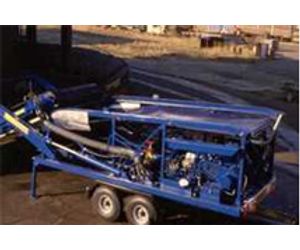 The power for the unit, which is completely self contained, is supplied by an air-cooled diesel engine running at a very modest speed. This drives a tandem hydraulic pump unit fed by oil from a large capacity reservoir. One of the pumps supplies the main chain drive roller and also the hydraulic cylinders which deploy and extend the chain belt carriages. The second pump supplies hydraulic power to a low speed motor driving a powerful product transfer pump which is piped so that it may transfer product from the machine to storage. It may also be reversed so that it can pump from the storage side to skips, trucks or road tankers etc. Each operation is controlled by a single lever valve.