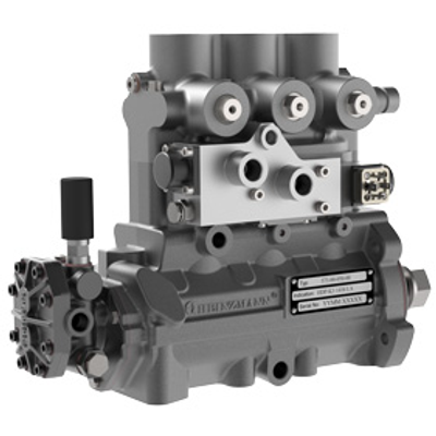 A high-pressure pump with 3 pressure elements for handling system pressures of up to 2,400 bar, with a delivery rate of up to 15 l/min (1 pump) or 30 l/min (redundant operation with 2 pumps). It is installed using flanges or on a base.