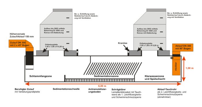 Sedimentation system with lamellar clarifier (PATENT) permanent damming filter system , material PP, Ø 1,000 mm x L 6,000 mm, filter performance / flow rate according to DWA-A 153, connections according to specifications, connections for ventilation etc. Emergency overflow, 2 pcs. Dome attachment DN 600 for on-site dome shaft construction.