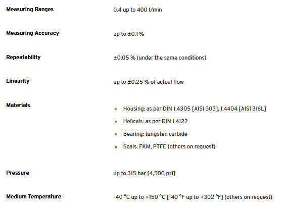 The SRZ ST helical flow meter series (ST for standard version) are flow-measuring devices that are used mainly in highly viscous, abrasive, filled as well as lubrication and non-lubrication media. Thanks to its concept, temperature fluctuations and the resulting change in the viscosity of the medium only marginally affect the measuring accuracy of the SRZ ST. This makes it especially well suited for use in test stands and for measurements with changing application conditions. Helical Flow Meters in Standard Design for high-viscosity and abrasiv media.