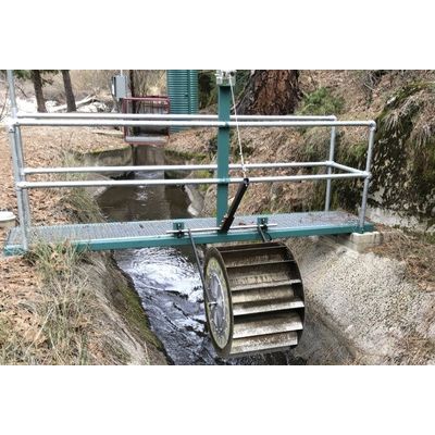 The Helios PowerWheel also has a patented lift system, which can swing the unit out of the water if large debris or obstruction stop the wheel and pose a risk of water overflowing.