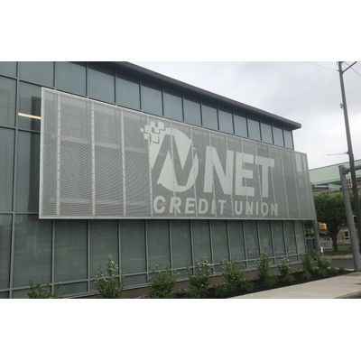 - Custom signage with perforated sheet images