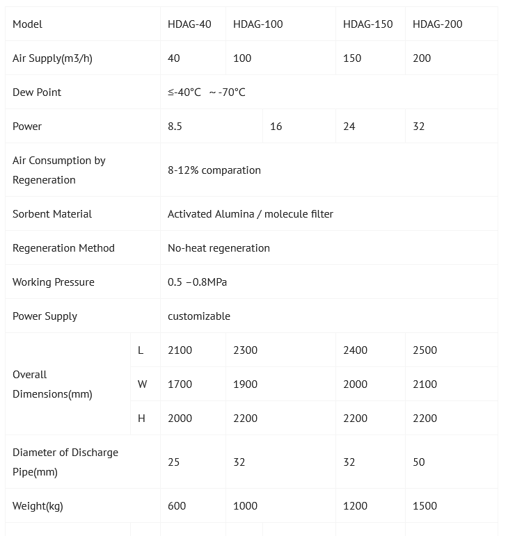 • The machine is integrated design, optional PLC automatic control, automatic detection of various operating parameters, compact and reasonable structure, good drying effect, low regeneration gas consumption, long working life, good use of composite desiccant, life expectancy than ordinary adsorption The agent is more than three times longer.