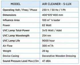 Titanyum Dioksit (Ti02 ) Filtre: Aircleaner S-LUX preventing of virus, bacteria, fungus, mold accurance by the Ray out of UVC Lamp. It disarms the organic particles hanging in the air (VOC) by immediate decomposition. Additionally, Titanium dioxide filter can clean itself by reacting with UVC Lamp without any seperate cleaning process. It can be used for long years effectively without any harmful effect to the environment and human body.