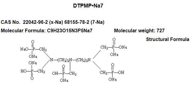 DTPMP Na7 is a scale inhibitor, for barium sulphate in particular and a chelating agent. DTPMP Na7 can be used as stabilizer for peroxide bleaching, detergent auxiliaries, in industrial & municipal cleaning water, terrestrial heat water, oilfield water, etc.