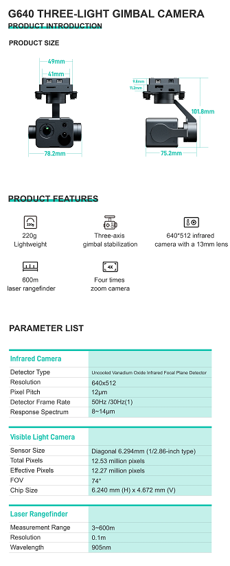 The G640 Triple-Sensor Gimbal Camera is a highly integrated device that combines thermal imaging, visible light camera, and laser rangefinder into one unit. It is compact, robust, and extremely lightweight. Whether it`s day or night, the G640 is an excellent tool for inspections. With a total weight of only 220 g, it can be flexibly mounted on various small drones, unmanned boats, and robotic devices. When paired with a laser rangefinder module, it can achieve functions such as target coordinate calculation and tracking.