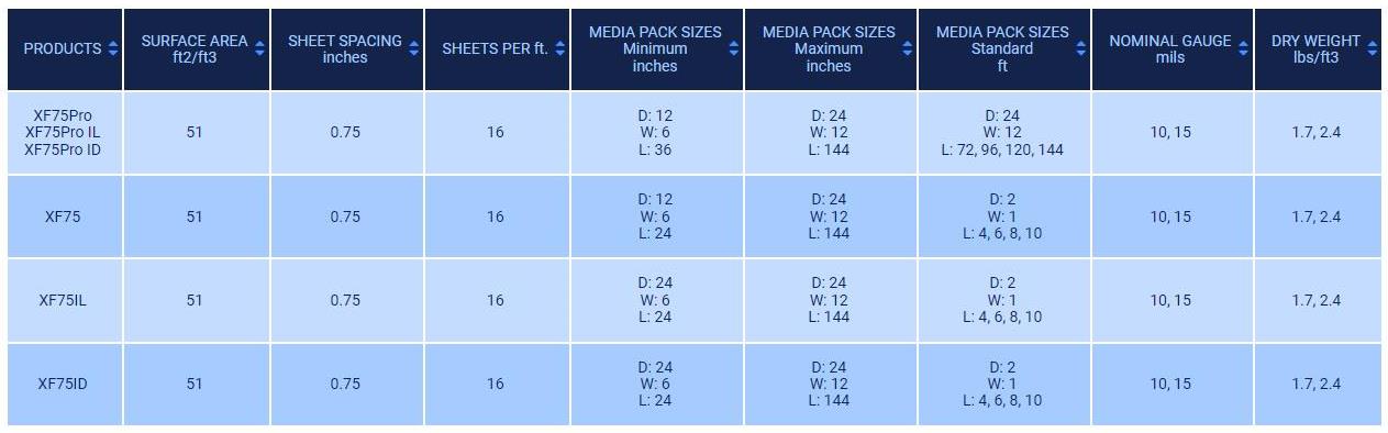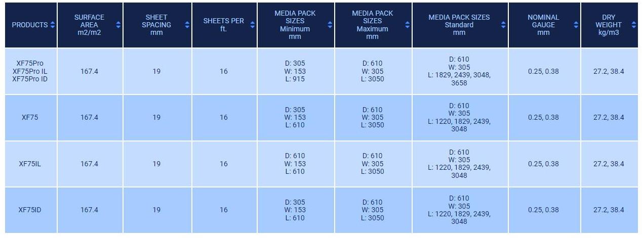 XF75Pro Crossflow fill improves air and water management over first-generation crossflow film fills, enhancing thermal performance by up to 10%. A new flute structure reduces pressure drop to improve thermal capability, and the enhanced structural design provides increased vertical pack strength, allowing for optimum product weight-to-height ratios. Herringbone fills with integrated inlet louvers (XF75Pro IL) and drift eliminators (XF75Pro ID) complete this efficient, high-performance, crossflow media system.