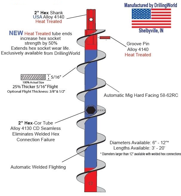 Also available from DrillingWorld: Hex-Cor Augers - Heat Treated Ends: 1-5/8” Hex, 1-1/8”, & 13/16. Jet augers with threaded connections including API, NWJ and AWJ. Hollow Stem Augers & Heads: 3-Key, 2-Key, Octagonal, Diedrich.