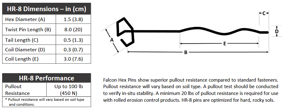 Falcon Pins by Western Green are a patent-pending fastener designed to secure erosion control mattings in place with a pull-out strength up to 10 x that of sod staples. The Falcon HR-8 has a unique 'corkscrew' coil configuration designed for hard, rocky soils. With the 'hex head' shape, the HR-8 pins are easy to install using a hand drill with a 1.5" socket attachment. For faster and easier installation, a custom driving socket is available. HR-8 pins are galvanized, made in the USA and can be installed on ARRA projects.