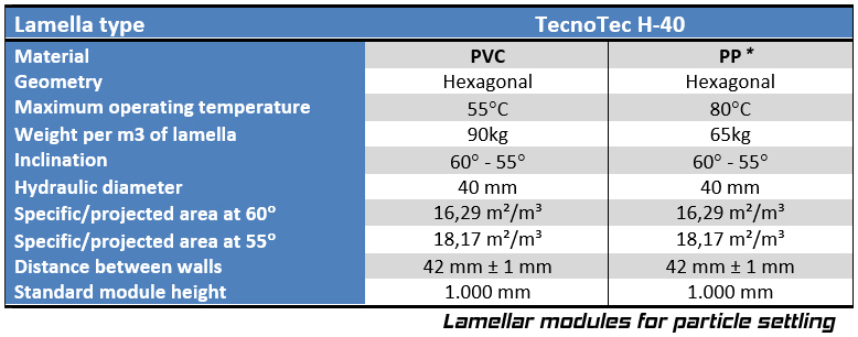 Sedimentation is the one most widely used process to separate solids from liquids. The TECNOTEC Lamella Modules increase the specific contact surface, causing an acceleration in the suspended solids separation thus accelerating the decantation process. Lamellae are ideal for depuration, potabilization and storm tanks. Besides, installing lamellas in decanter tanks allow the increase of treatment capacity without modifying the tank structure. A good lamella decanter dimensioning secures a very high decantation performance. Our Lamella, fabricated in our own facilities, are manufactured in PP and PVC and comply with the RD 866/2008 and directive 2002/72/CE “contact with food and drinks”.