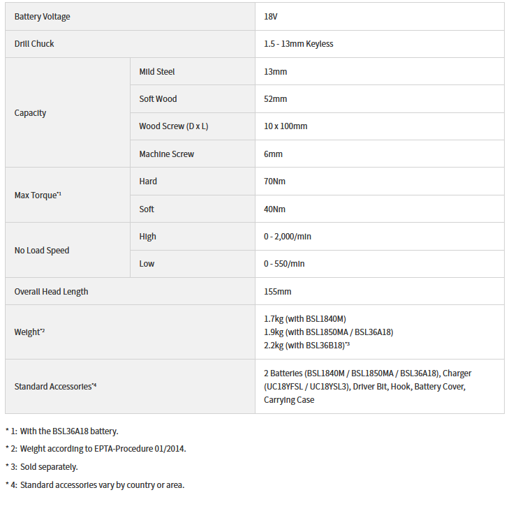 Drilling Speed (The speed of DS18DBSL is indexed as 100.). Using a ?18mm drill bit to drill through 76mm thick SPF with high speed (2) mode. When the tool bit is suddenly overburdened during operation, the built-in controller stops the motor output before the entire tool jerks. DS18DBSL cordless driver drill. The value is shown for reference purposes and may vary according to materials and conditions.
