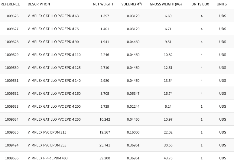V.IMPLEX GATILLO PVC EPDM 63. Net weight 1,400. Volume(m3) 0,03129. Gross weight(Kg) 6,16. Units box 4.