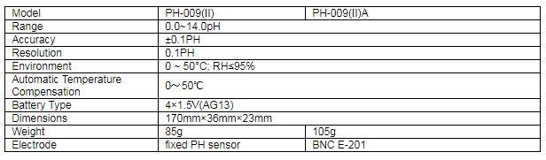 Model 009(II) pen-type pH meter uses combined pH electrode of high sensitivity, fast response, and good repetition as probe. With large liquid crystal digits display, the meter is reliable, stable, portable, and convenient to operate, especially for field measuring. It is praised by home and aboard. This product has been exported in batches. It is applicable to determine pH value of water solution in departments of medical treatment, environment protection, scientific research, college, swimming pool and mechanical plant etc.