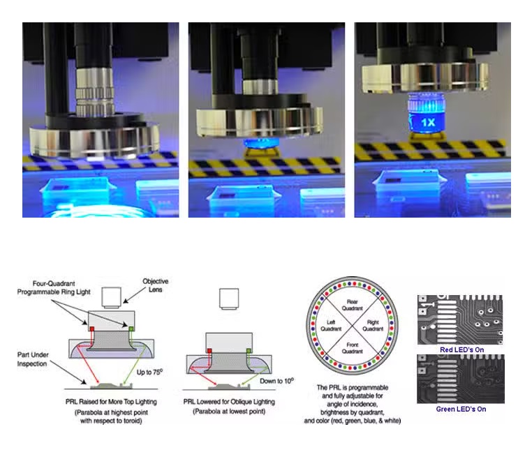 All VIEW systems are equipped with high brightness LED illuminators. LEDs offer long life, low power consumption and cool operation. In addition, LEDs allow the color temperature of the illumination to be closely controlled. Back-light and through-the-lens surface light are standard on all machines. During programming and automatic measurements, the light source and intensity for each measurement may be programmed to best illuminate the feature of interest. For surface features that are at an angle with respect to the X-Y plane, VIEW’s Programmable Ring Light (PRL) may be used.
