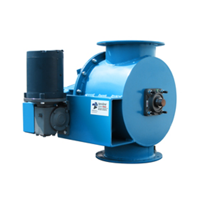A rotary valve’s design is similar to a revolving door by which one might enter a building: material must pass through a rotating chamber in order to reach the opening on the other side. The turning vanes of the rotary valve are tightly spaced to the valve walls, creating an airlock. Vanes may be tipped with hardened metal or flexible wipers. This rotary valve is motor driven; the motor and its controls must be part of the specification.
