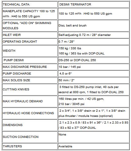 The DESMI TERMINATOR incorporates the DESMI DOP-DUAL 250 pump that has a capacity of 100 to 125 m³/h (depending on choice of power packs and drive motors). This pump is also able to develop discharge pressures up to 10 bar / 145 psi - while maintaining nearly maximum flow! Now available with thrusters for remote positioning, add-on DBD or belt skimmer modules.