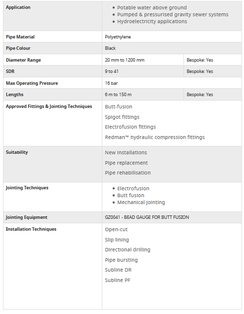 PE100 High Density Polyethylene (HDPE) pipe - For potable water above ground, pumped & pressurised gravity sewer systems and hydroelectricity applications. Manufactured from conventional PE100 (HDPE) material, our solid wall polyethylene black pipes are ideal for potable and non-potable water applications, specifically for pumped and gravity sewer and hydroelectricity purposes. With our capability to manufacture bespoke diameters up to 1200mm as well as non-standard lengths and SDRs, our polyethylene pipes are ideal for use in pipe rehabilitation projects, as a liner for damaged metallic pipelines.  Strong, lightweight and flexible, our pipes can be joined together using standard electrofusion or butt-fusion jointing techniques.