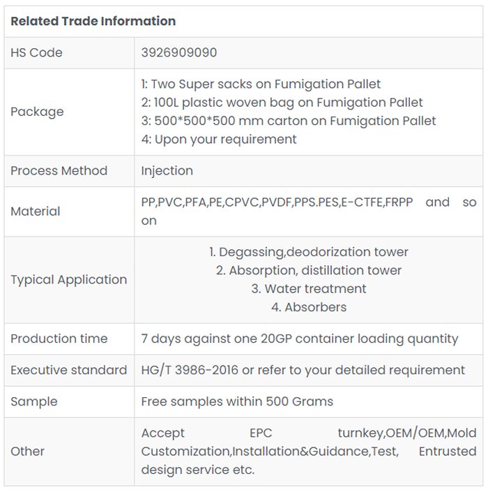 The Plastic Teller Rosette Ring is designed for optimal performance in gas absorption, mass transfer, and liquid particle removal within scrubbing towers. This high-efficiency packing material comes in various sizes including 25mm, 47mm, 51mm, 73mm, and others, and is manufactured using materials such as PP, PVC, PFA, PE, CPVC, PVDF, PPS, PES, E-CTFE, and FRPP. It is engineered to promote the regeneration of liquid surface areas, thus enhancing gas absorption efficiencies. The ring's filamentous toroidal helix shape aids in the collection of solid and liquid particulates, minimizes pressure drop, and eradicates the need for liquid redistributors by promoting circular motion of the liquid, thereby overcoming the tower wall effect. Typical applications include degassing and deodorization towers, absorption and distillation towers, water treatment facilities, and absorbers. It adheres to the HG/T 3986-2016 executive standard and offers flexible packaging options including super sacks, plastic woven bags, and cartons on fumigation pallets.