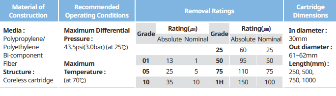 Non-Grooved High Flow Depth Cartridge Filters are constructed of the PP/PE Bi-component fibers. It has the used 100% PP/PE Bi-component fibers to create. 3-Dimensional Skeleton Structures. It is the High Functional filter that maximizes the High Water Flow Rate and Removal Efficiency of the processed water and chemical solution. It also maximizes the combining power of each non-woven layers. It is the Heat-combination Chemical Free filter. And it keeps a High-level cleanness.