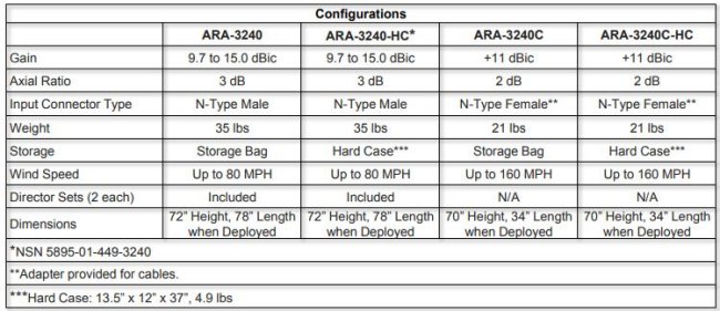 The ARA-3240 Series hosts extremely rugged and portable high-gain UHF SATCOM antennas that are available in full and compact sizes. These antennas are ideal for tactical command posts and temporary fixed site applications. The compact version is ideal for operation in high winds. The right-hand circular polarized (RHCP) antenna is designed to operate from 240 to 318 MHz at 200 Watts CW. These antennas are designed with exceptionally high gain, low VSWR, and rapid deployment. The antenna complies with MIL-STD-810G environmental standards for vibration, shock, temperature, loose cargo, and immersion.