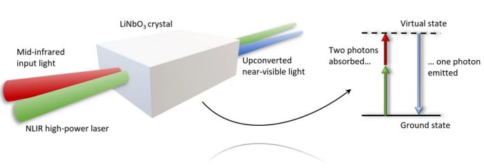 The schematic pointed to by the arrow illustrates energy conservation in the upconversion process where one photon from the high-power laser field and one MIR photon combine and become one near-visible light photon; the length of the arrows signify the energy and, hence, wavelength. The reason for the term “Virtual state” in the top of the diagram is that the photons are not absorbed to a physical state in the crystal (as is the case for electronic absorption) but only interact with bound electrons through electric forces.