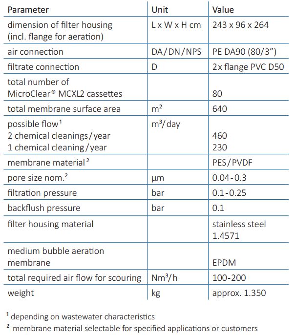 Complete assembled units for biological wastewater treatment with submerged membrane cassettes, including: Membrane cassettes MicroClear MCXL2. Filter housing made of stainless steel 1.4571. Membrane tube diffusor for medium bubble aeration in the filtration tank optimized for the plate distance of the MicroClear filters.