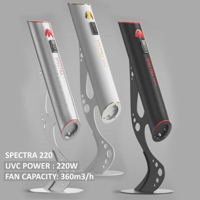 High-performance sealed germicidal radiator with an output of up to 220W UVC radiation. High fan power: max 360m3 / h. Equipment colors: Black mother-of-pearl, white or brushed stainless steel. Possibility of mounting: On the ceiling, on the wall, on a stand.
