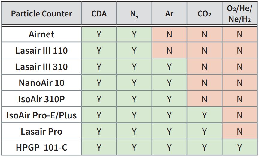 The HPD III will effectively reduce the pressure of a gas line from 120 psi to atmospheric pressure and is compatible with non-toxic, nonflammable gases such as Clean Dry Air (CDA), nitrogen (N2), argon (Ar),and carbon dioxide (CO2). See the table below for a visualization of what particle counters are compatible with which gases.