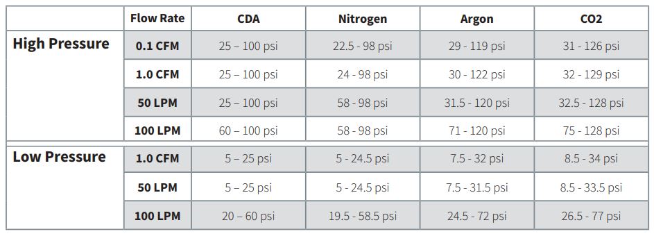 - Can be used with Clean Dry Air (CDA), argon (Ar), nitrogen (N2), carbon dioxide (CO2), or other non-toxic inert gases (see table for compatible gases)