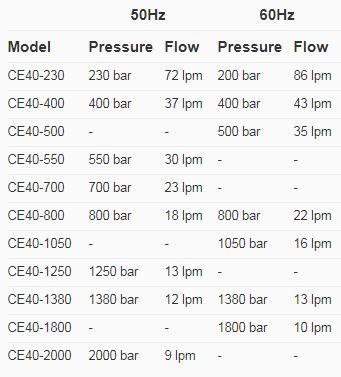 The CE40 series of machines are electrically driven pumps with a pressure from 230 to 2500 Bar and from 6 to 73 L/min in flow. The frames are made from hot dip galvanized pressed sheet metal parts and stainless steel perimeter frame rails. Front castor wheel and two big pneumatic wheels with brake for easy maneuvering and stable parking. One hook lifting eye.