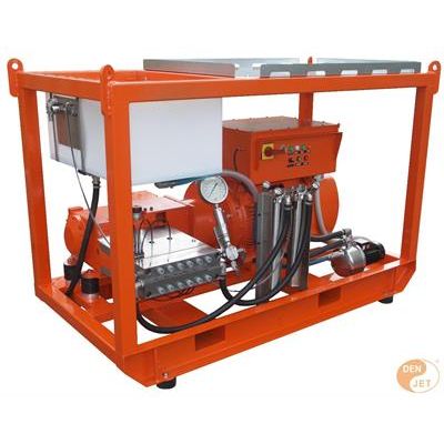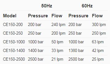 The CE150 series of machines are electrically driven pumps with a pressure from 200 to 2500 Bar and from 21 to 240 L/min in flow. The frames are made from hot dip galvanized pressed sheet metal parts and stainless steel perimeter frame rails. Four rubber feet for secure positioning One hook lifting eye.